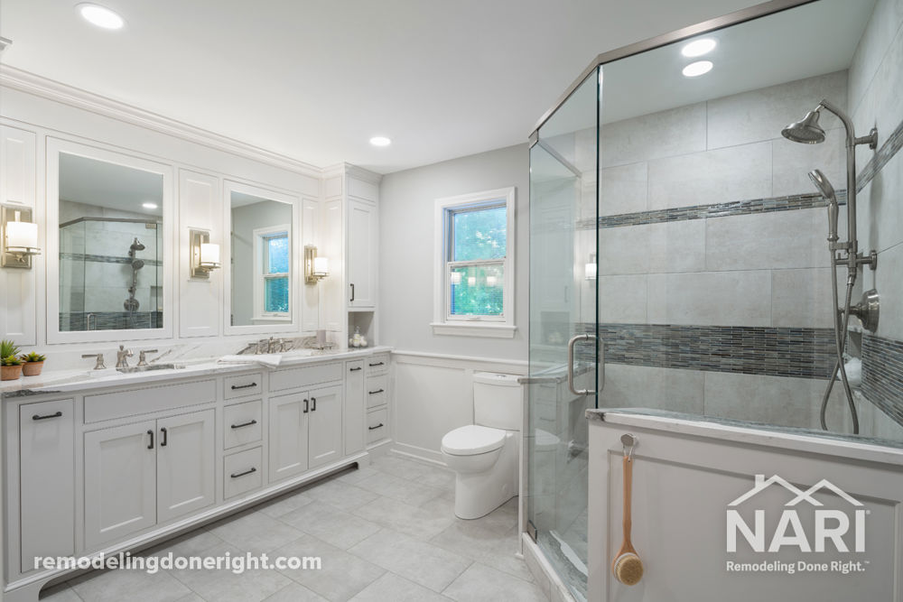 These empty nesters wanted to remodel and reconfigure their dated 1990s bathroom. They desired a more luxurious and relaxing space that reflected the design style of the rest of their suburban home. Although the vanity was an adequate size for countertop space, the height and configuration were inadequate for their grooming needs. The clients also wanted the built-in tub and deck removed to create room for a larger shower. Now, light greys and whites are accented with black and brushed chrome in the space. The new layout also makes the room look bigger, even with the larger shower!
