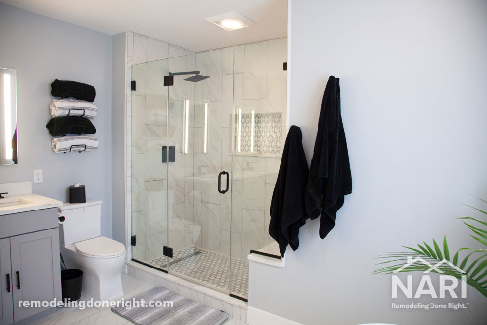 This master bathroom renovation included both demolition and general construction, wall preparation, plumbing, electrical work, tile work, carpentry, countertops, sinks, fixtures and paint. The frame over the vanity was modified to accommodate two single recessed medicine cabinets. Ceramic tile was installed in a grid pattern in the shower and on the bathroom floor. A quartz shower bench piece and shower sill were incorporated as well, along with frameless hinged shower glass. A new light grey vanity base complements the color scheme. Fixtures such as shower trim, shower head, robe hooks, towel rings, and new sink faucets were installed as well.