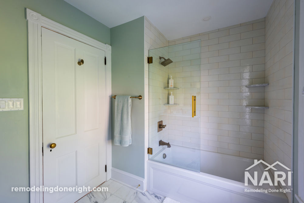 Balancing historical integrity with modern updates was key for this bathroom remodel. By expanding the footprint, building a new tub and shower, and reinstalling the original window and door trim, this bathroom now leverages natural light and better mobility for a spa-like space meant to be enjoyed for years to come.