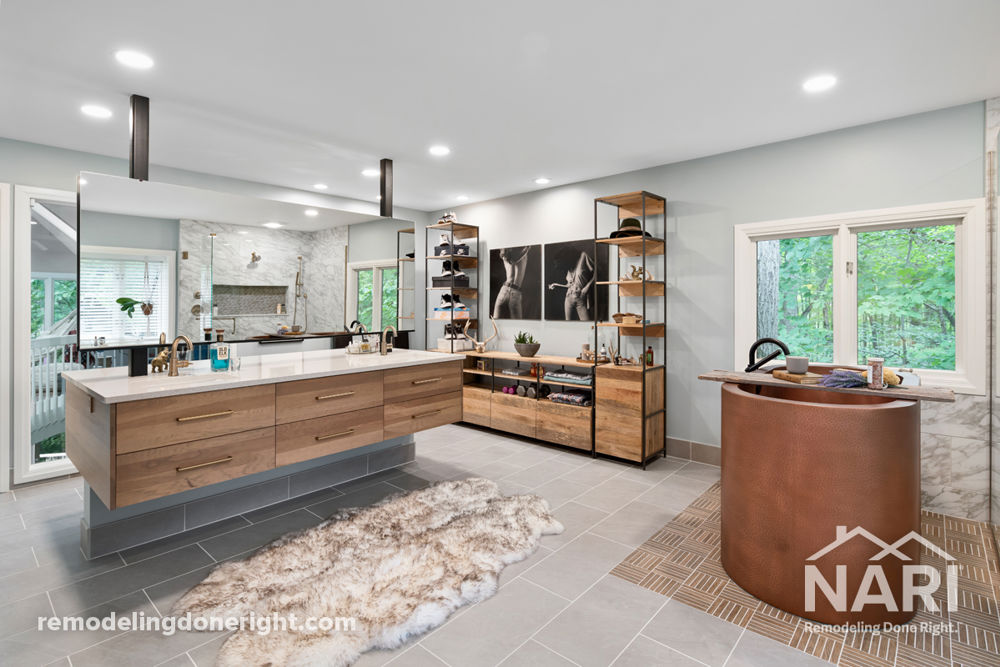 This bath's original design caused a lot of congestion and the awkward layout of the room made it feel dark and closed off. Without changing the location of the windows or plumbing, the design options were slightly limited. But the removal of an oversized jacuzzi tub opened the area and a new two-sided, floating vanity island gave extra room for the homeowners to use at the same time. The overall outcome was a bright, open primary bathroom with a natural feel and efficient use of space.