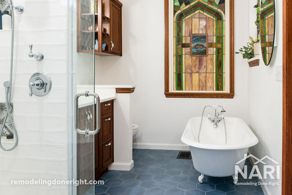 This updated bathroom design mixed antique elements with modern appliances and an updated floor plan that turned cramped and cluttered into fresh and bright. The new lighting, colorful tiles, and custom storage solutions amplify the vintage-meets-contemporary style that is carried throughout the rest of the home.