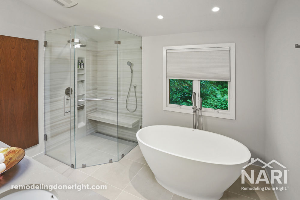 Once outdated and claustrophobic, this master bathroom feels renewed and bigger. The challenge was creating an open feel without moving walls. A free-standing tub, glass shower wall, floating vanity, and a wall-hung toilet helped to create additional open floor space. A recessed linen closet also provides extra storage for towels and toiletries.