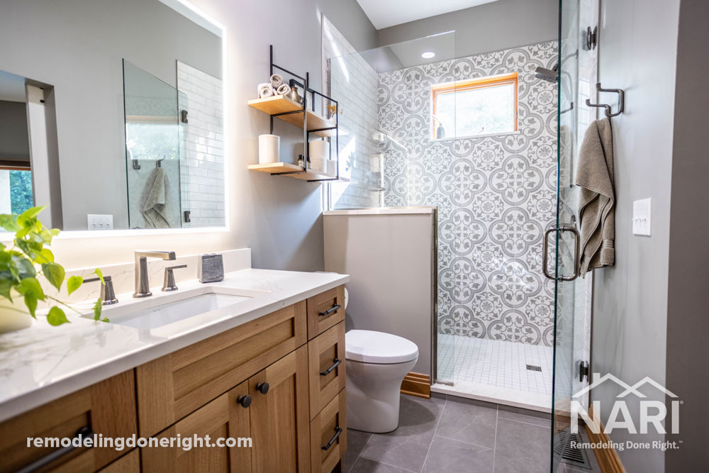 This 1980s-style bathroom didn't match the rest of the home, so an entire overhaul went underway. By removing the wall between the vanity and the wet room, relocating the toilet, and installing a new closet organization system, this bathroom was transformed with renewed functionality. Airy finishes, sleek fixtures, and a back-lit mirror catapulted this space into the modern era.