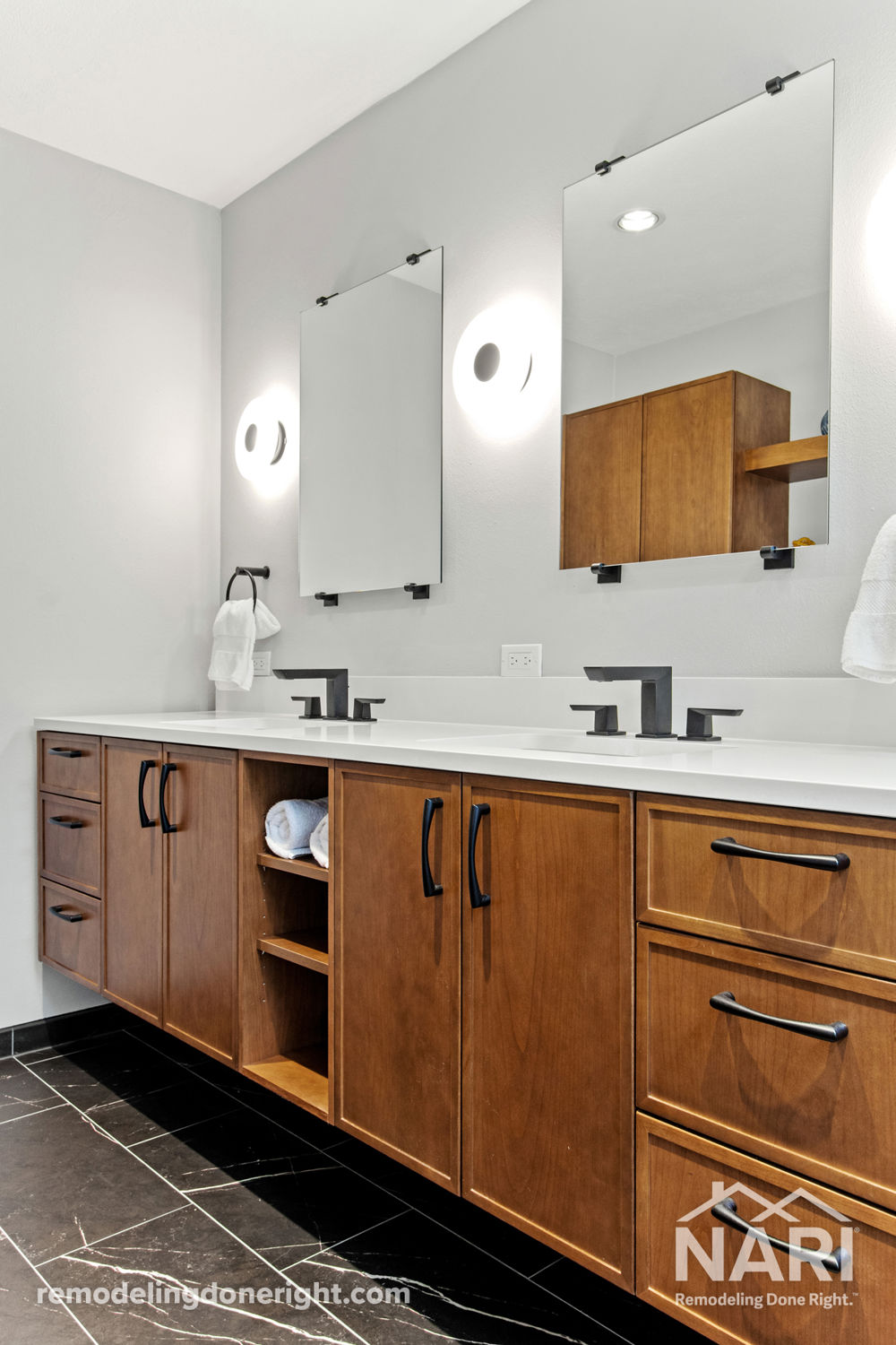 Keeping with the homeowners' midcentury modern style, ultra-thin wood-toned shaker cabinetry floats around this black-and-white remodeled bathroom. Bright blue accent tile in the shower packs a visual punch. To create openness, an unused tub, carpet, a zero-privacy commode, and a cave-like shower were removed. Unused closets and flipping their locations opened the floor space and doubled the shower size in this now retreat-like bathroom.