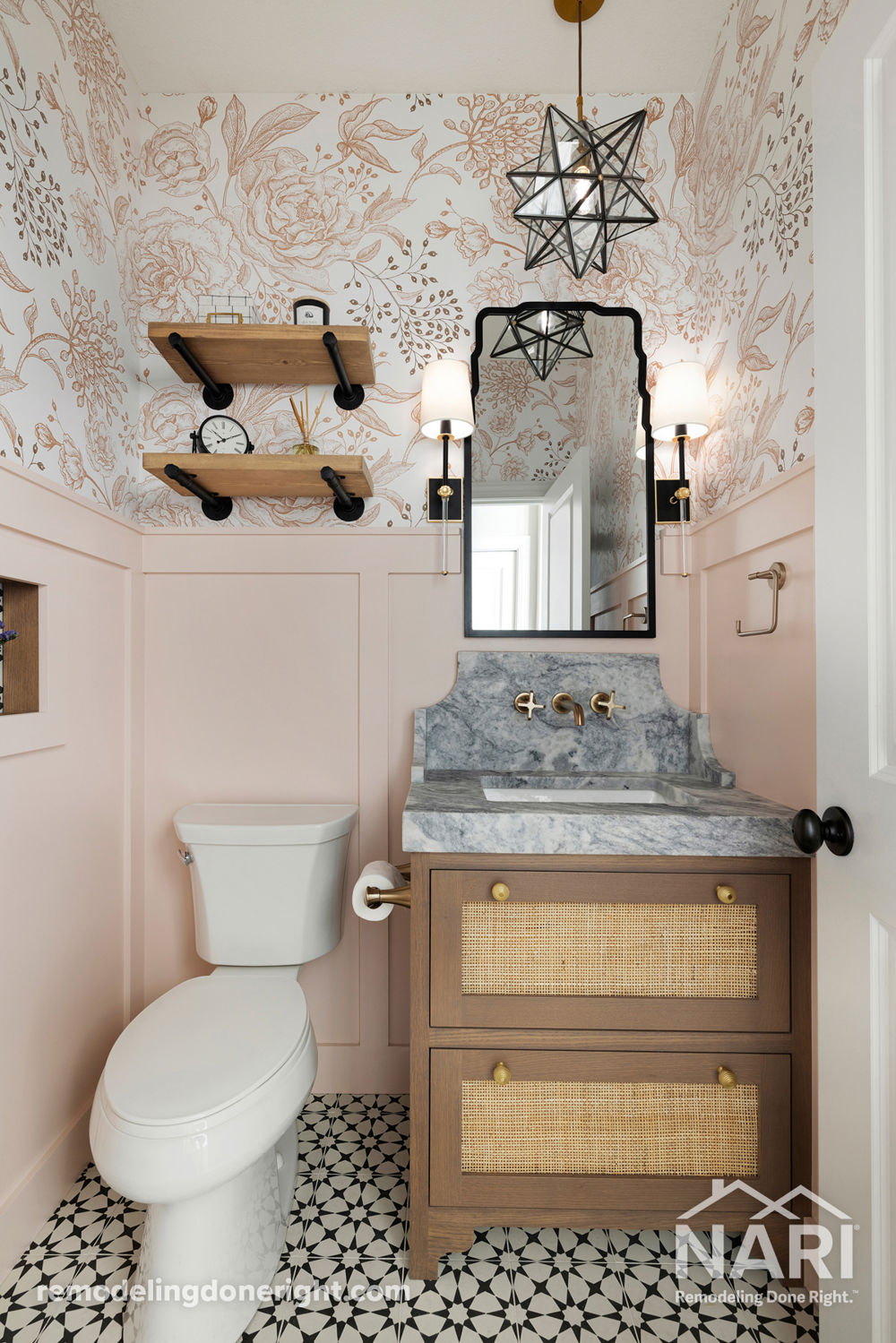 This small powder room, located in a very busy part of the home, off the mudroom, and on the way out the door adjacent to the kitchen, received some extra attention. Replacing an old pedestal sink, the bathroom was transformed into a feminine farmhouse-style lavatory that reflected the client's younger girl's personality. Playing on whimsical and geometric patterns along with fun lighting and colors, this is not your ordinary lake house powder room!