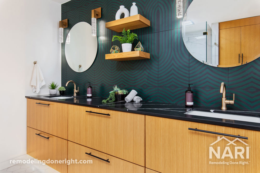 Working within a tight budget and square footage, with some ingenuity this bathroom remodel reflected the homeowner's style and desire for a spa-like atmosphere. Removing the tub and installing a roomier shower along with updated double sinks, helped check off the wish list for privacy, a better layout, and a therapeutic showering experience. This is now an Instagram-worthy primary bathroom with loads of sophistication with an Art Deco influence.