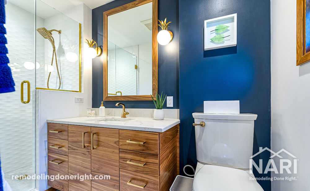 To incorporate this homeowner's modern aesthetic into their master bathroom, remodels were made to transform the space. By taking room from the adjacent hall closet, the shower was expanded to include a built-in corner ledge and was then layered with textured wall tiles. A new vanity was installed to provide additional storage space. To tie off the design, bright tile finishes and brass fixtures complement the warm wood and navy walls.