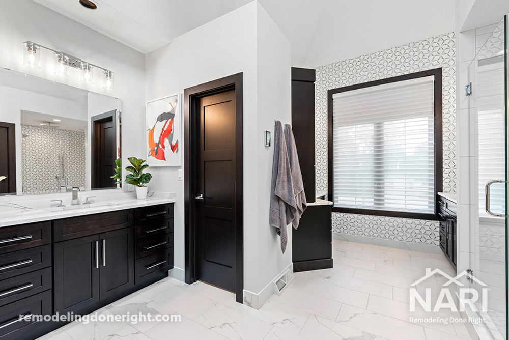 The master suite had a very large bathroom that needed functionality. Eliminating the tub and adding an extra large spa shower experience with body sprays and a rain head gave spa-like features. The area around the window opened up for a new vanity and large sit-down make up area. One of the bonuses of the project is more closet space. The spa shower operates with a digital key pad. The combination of the gloss tile, the hex floor tile and the marble and mirror mosaic tile provides layers of texture.