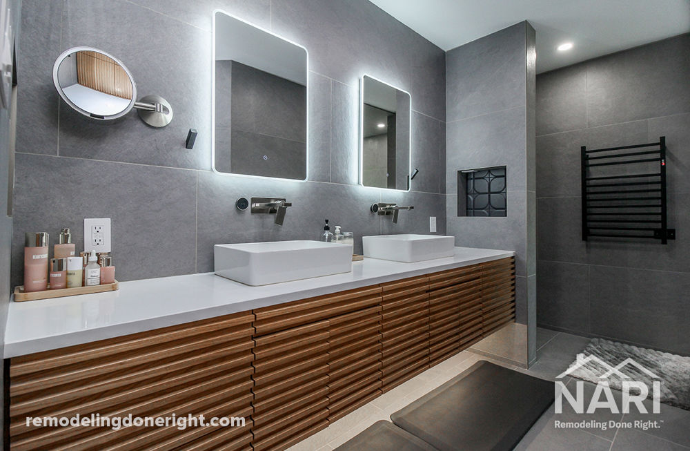 Our clients indulge in tranquility in their newly designed primary bathroom - a modern oasis influenced by Japanese Zen. The floating, solid oak double vanity is a breathtaking focal point. The seamless integration of tile from floor to ceiling and a freestanding soaking tub inside the wetroom exudes sophistication. Modern amenities such as backlit vanity mirrors, a towel warmer, automatic-lid bidet, and digital touch controlled shower heighten the contemporary ambiance. Natural light creates a warm, inviting environment for rejuvenation. This mid-century modern home offers a peaceful escape from daily life.