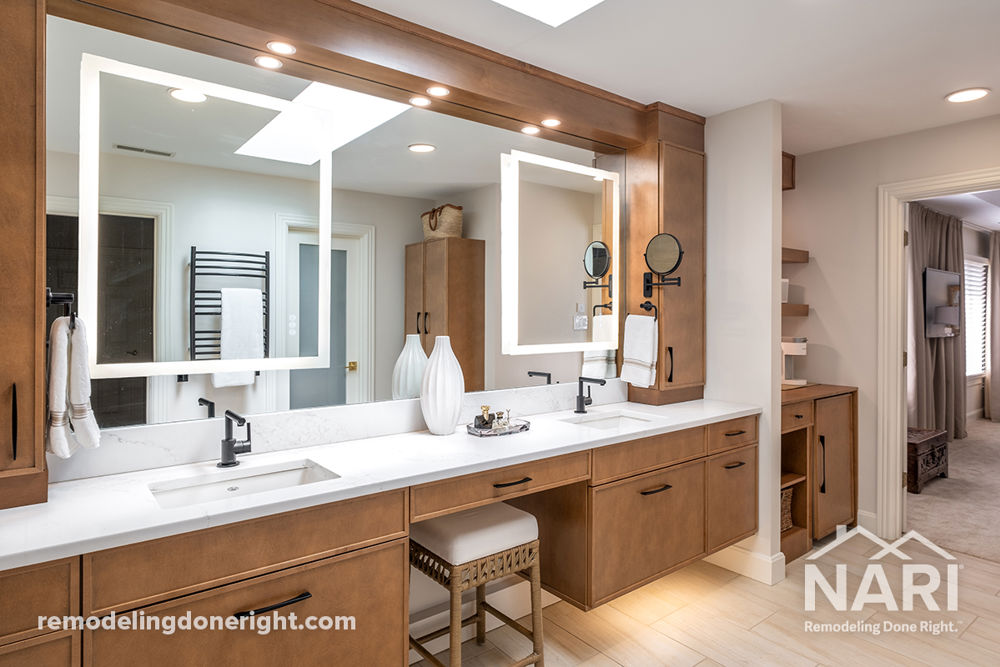Spa bath extraordinaire. Great client with the ability to think outside the box and allow it to happen. The openness to go beyond is how we categorize this client and job. Our vision together to complete a spa bath with class, ingenuity, design flair, and storage came to fruition. Creating a wet area for the tub and shower with ability to use both freely interrupted by the other is spectacular. The feeling of freedom and openness with the floating vanities and visual quietness speaks volumes. The coffee center is an added bonus for this owner suite haven.