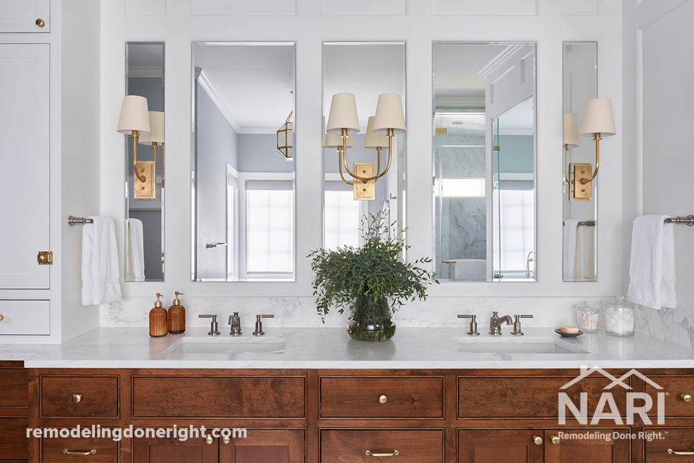 The primary bathroom of this home had not been updated since the 1970s. The homeowners wanted a space to relax and unwind with more storage, better flow, and a steam shower. They partnered with a local design-build firm to transform their space into a sophisticated primary bathroom.
