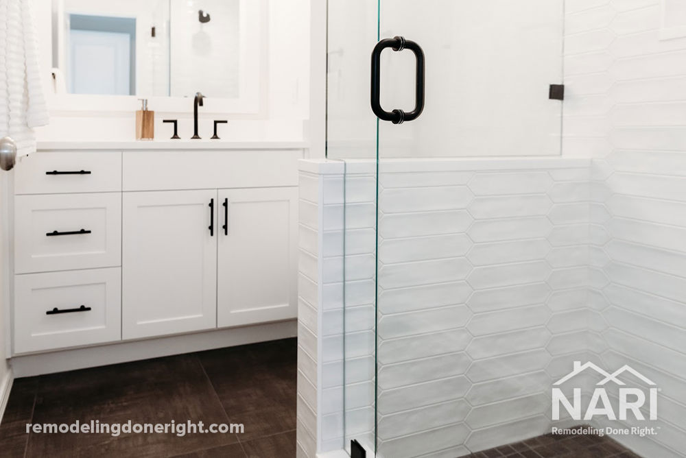 The conversion of this compact 90s primary bathroom into a more spacious area within its original footprint presented a challenge. However, the outcome is a striking realization of the client's wish for a brighter, modern space. This was achieved through partially removing the shower wall, lighter colors, a large mirror, a clear glass shower, and well-placed lighting.
