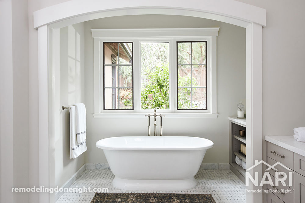 This bathroom elevated the home's oasis with a serene spa-inspired bathroom that seamlessly blends modern tranquility with Mediterranean charm. Despite the architectural leaning towards a Mediterranean aesthetic, characterized by dark wood tones and arches, the space was transformed into a haven of relaxation. Retaining key Mediterranean design elements, such as the graceful archway leading to the tub area and consistent window styling, light-toned cabinets, tiles, and paint colors were incorporated. The result is a harmonious fusion that fulfills our client's desire for a soothing retreat while complementing the overall architectural elegance of their home.