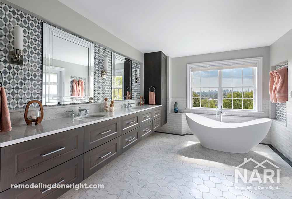 Dissatisfied with the cookie-cutter primary bathroom in their brand-new home, these homeowners dreamed of a space that reflected their personal style. Visioning a luxurious haven infused with artistic details, the opened space provides a more cohesive floor plan that accentuates their Boston skyline view. A floating vanity wall sets the tone and creates an elegant ambiance, complemented by a glass-enclosed shower and a freestanding soaking tub that allows one to truly soak up the view.