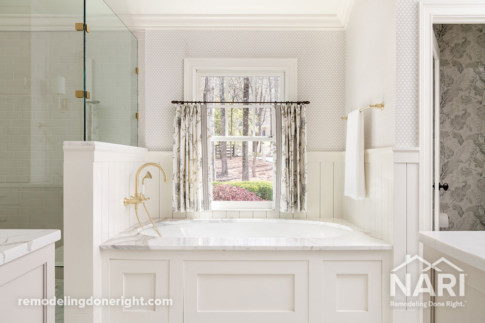 The homeowners' primary suite underwent a complete change from the previous dark-colored and dated style, and lack of functionality. The new space has a warm neutral color palette with touches such as the custom-window treatment and Schumacher Wallpaper, with splashes of gold bouncing off the Honey Bronze cabinet pulls and various brass plumbing fixtures. The cabinetry include two matching vanities, a makeup table with pull-out storage space. Not to mention, the standing shower was designed for aging in place.