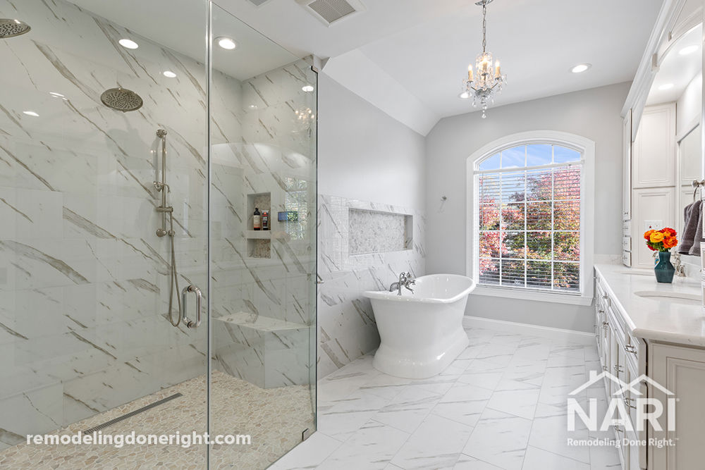 The old bathroom was dysfunctional. A couple of closets took over the space, two separate vanities chopped up the space, and the back wall was filled with a built-in decked tub. There was literally no room in this bathroom. The shower was tucked away, and it was small. The commode space needed to be changed in location to make room for a large shower. The tub was replaced with a slipper tub and rotated to make space for a long and much more useless double vanity with lots of cabinetry and tall linens.