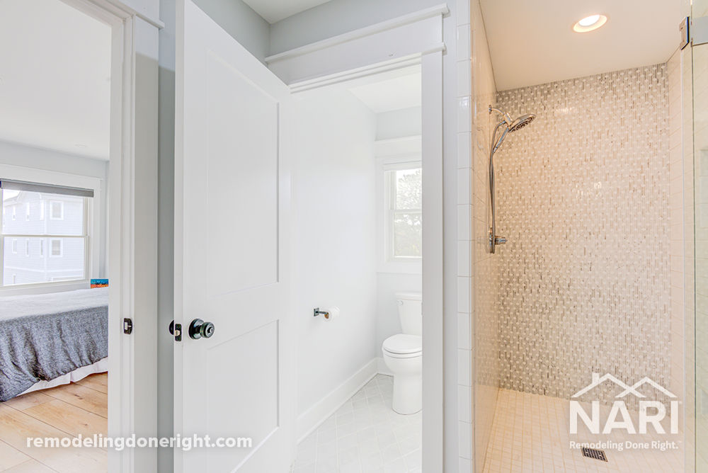 It took skilled craftsmen and specialty contractors to implement numerous details to satisfy this homeowner's discerning taste and need to modernize and enlarge a 1980s elevated manufactured home. The bath remodel was part of a whole home renovation project. The renovation allowed for a larger bath with an updated shower stall, custom niches, and a private water closet. A mix of custom cabinets, stone countertops, new windows, door hardware, patterned ceramic tile flooring and shower walls, stainless steel plumbing fixtures, framed mirrors, and more were added. These homeowners are elated with the outcome.