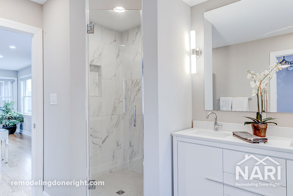 Looking to create a new guest ensuite, this bathroom transformation was part of a larger home renovation. The large double sink vanity, custom tiled-shower, and private water closet will comfortably accommodate friends and family, while a mix of custom cabinets, stone countertops, and stainless-steel plumbing fixtures make the space feel cohesive with the home's surrounding luxuries.