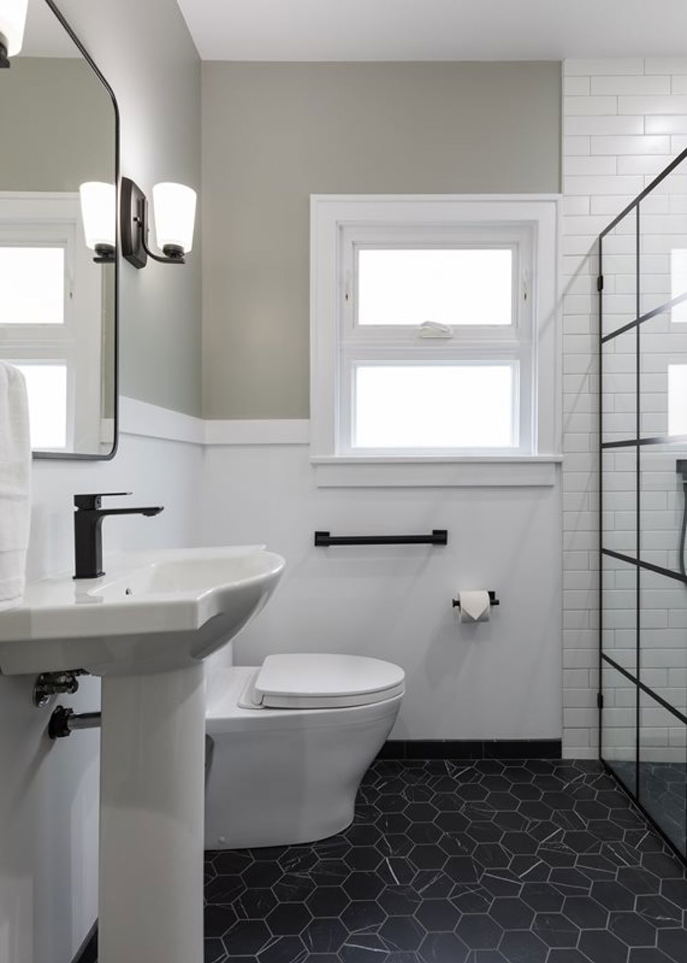 This remodel addressed issues including peeling vinyl flooring, outdated fixtures, and safety hazards due to deferred maintenance. Challenges included: sourcing budget-sensitive materials with a high-end feel; slip-resistant hexagon floor tiles; a new pedestal sink; a water-saving toilet; and a larger medicine cabinet, while correcting code violations. Universal Design created an open floor plan, low-maintenance finishes, zero-threshold entries into the bathroom and shower, in addition to highly-contrasting materials, grab bars with blocking, accessible towel bars for user convenience, and dimmable lighting with anti-glare trim. We combined modern materials for a noir style and universal functionality for our aging-in-place clients and their forever home.