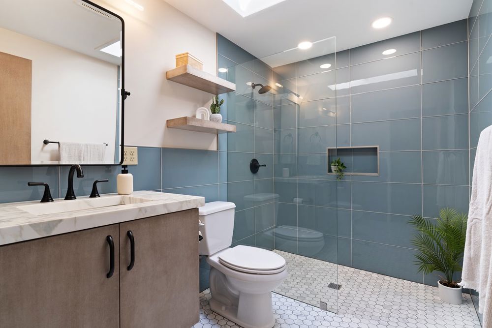 This bathroom remodel blends mid-century modern design with contemporary updates. Striking blue glass tile walls added bold color, while marble hexagon tiles on the floor maintain a luxurious, geometric feel. Custom cabinetry mirrors the stain of the original wood paneling in the home, preserving warmth and texture. New marble countertops reflect the original marble surfaces, maintaining architectural continuity while offering a fresh, polished finish. The remodel honors the home's mid-century roots while incorporating modern materials for a sleek, updated space that balances timeless elegance with contemporary functionality.