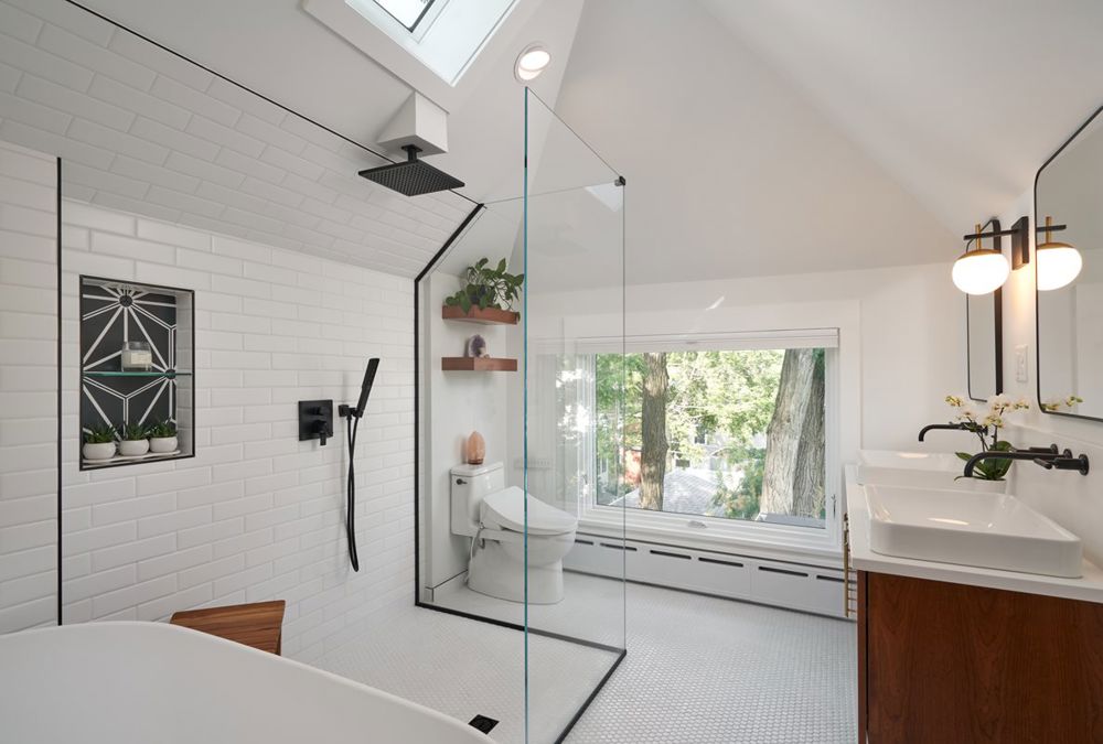 The Urban Oasis bath redesign project modernized a 1920s third-floor bathroom into a modern, open-plan space, integrated seamlessly with the clients' bedroom area. Key features include a dual-function shower zone, a skylight for plenty of natural light, and in-floor radiant heat for maximum comfort. The project achieved impressive functional enhancements by integrating a combo washer/dryer, increased storage, and a large awning window for superior natural light and ventilation. With its vaulted ceiling, contemporary finishes, and barrier-free layout, this space perfectly balances versatility with minimalist elegance, creating a modern oasis for the clients.