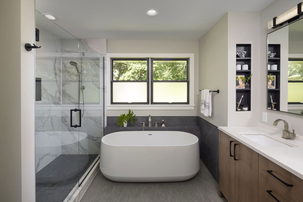 After decades in their home, the homeowners turned to their aging 1990s primary bath for a much-needed update. They envisioned a serene oasis with a two-person shower, freestanding tub, double vanity, and ample storage. During demolition, moisture damage and mold required structural repairs before reconfiguring the layout. A pocket door, new windows, and strategic wall adjustments created a more open feel. Large-format porcelain tiles, a sleek tub surround, and a warm white oak vanity enhance the spa-like aesthetic. Thoughtful details ensure easy maintenance. The result is a bright, restful retreat the homeowners love, blending beauty with everyday functionality.