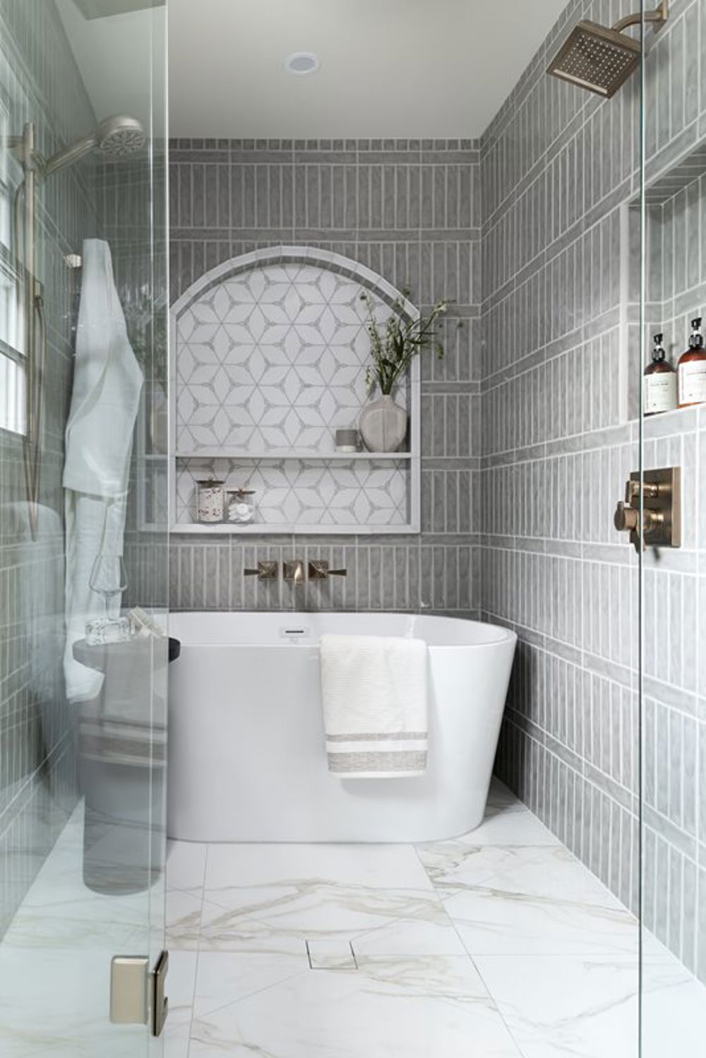 The client's sought to expand their primary bathroom for more space, storage, and a modern traditional feel. We repurposed an adjacent closet to feature a freestanding tub framed by an arched marble niche as the focal point. Sage green artisan tiles, warm wood tones, beadboard, and a floating vanity blend traditional charm with modern convenience. An arched knee wall adds privacy while echoing the shower niche. This design maximizes functionality, combining elegance and practicality, resulting in a luxurious space that reflects the home's colonial style with a contemporary twist.