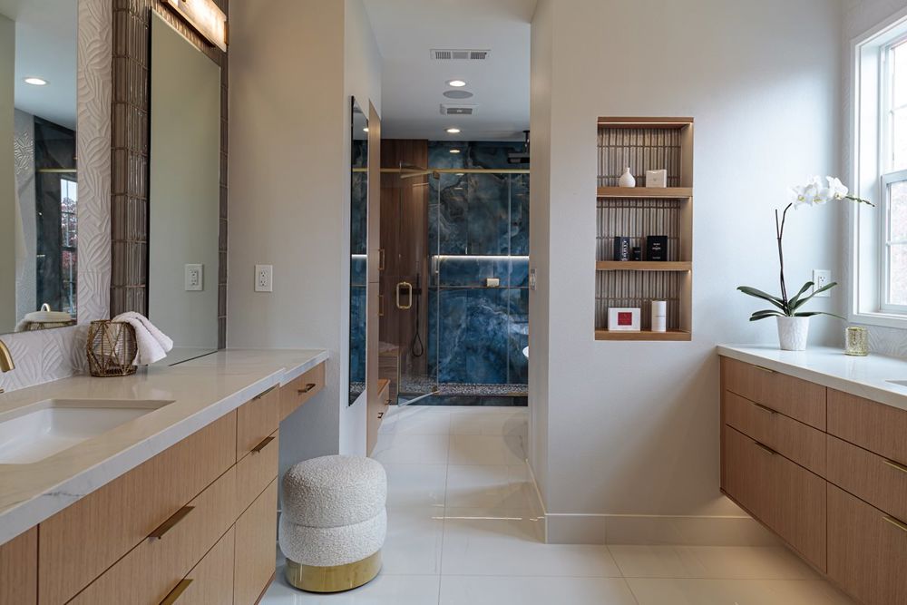 The clients desired a large primary bathroom that was luxurious, elegant, and serene. The color palette was inspired by the discovery of this gorgeous polished blue 'onyx' tile and beautiful sesame-colored 'bamboo' that covers the shower walls. Other luxe finishes include a lighted shower niche, a gold towel warmer, under-cabinet lighting, his-and-her Nickels vertical grain-matched vanities, Vadara quartz countertops, and a lighted makeup vanity. A Toto washlet, freestanding jetted massage bathtub, and matte black plumbing fixtures with a thermostatic valve in the shower, along with a linear drain, complete the luxe finishes in this dreamy bathroom.
