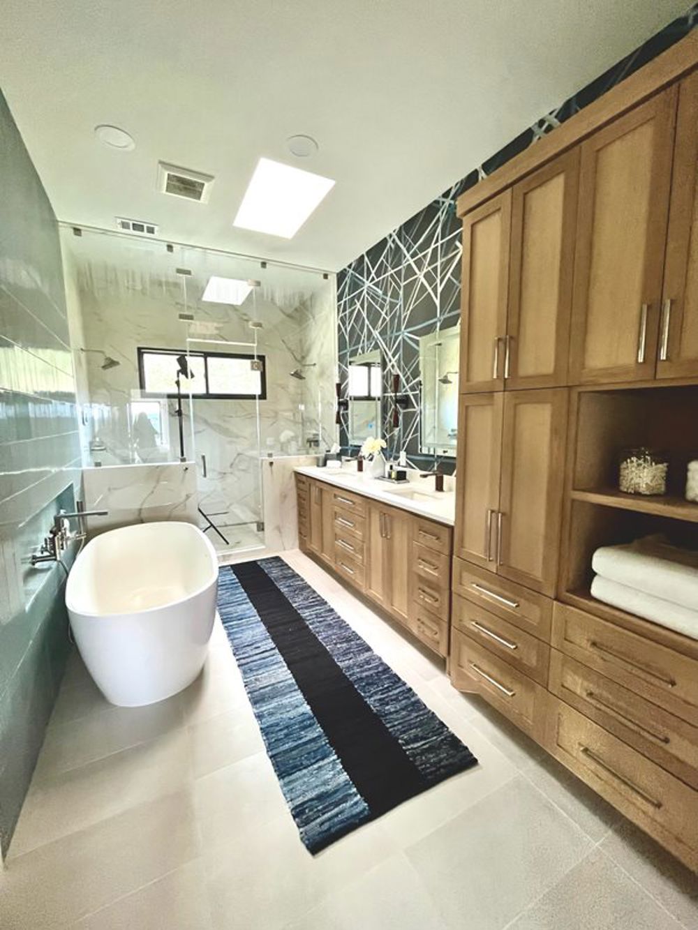 The client desired a transformation to the main bathroom of this stunning 1970s hillside home in Austin. Left untouched for decades, the remodel was entrusted to the pro by a multi-generational family to modernize while preserving its charm. Carpeting was removed, and the dividing wall between the vanity and tub was demolished to improve flow. The ceiling was raised from 8' vaulted to 10' uniform, enhancing grandeur. The space now features sophisticated blue grass corduroy wall tiles, Lumier floors, a luxurious steam shower, custom-stained cabinetry, and wooden-accented fixtures for a cohesive retreat. This reimagined bathroom brings the family's dream home closer to reality.