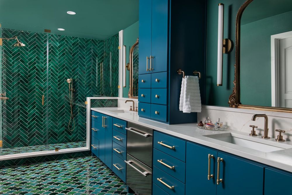 Our clients requested a bathroom that was drenched in color. We selected a tone-on-tone color palette of blues and greens, in oversaturated hues. Walls awash in bold shades create an invigorating atmosphere, while the patterned floor tiles playfully contrast with the vivid shower wall tiles, adding layers of visual interest and depth. Storage was also important in this space. Our team designed a cabinet tower with refrigerator drawers that divides the two vanities and provides functional storage for makeup and beauty products.