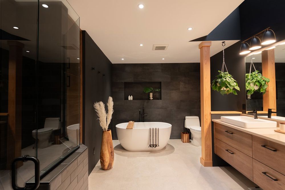 The owners of a beautiful condo located on the shore of the Willamette River wanted a dramatic bathroom with a free-standing tub as a focal point. By reclaiming space from an old shower and closet, a new open area was created for a beautiful soaking tub and tile shower to define the space. Dark finishes were mixed with rustic hickory wood accents, giving this room a modern, rustic look.