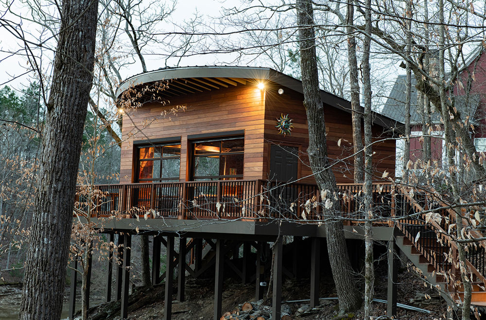 A client with a large family and kids transitioning into college wanted to create a space for them to enjoy on the weekends at their lake house retreat. After completing some minor deck renovations, the focus turned to a buffer lot the client owned. With a grade change of 12 feet over 20 feet, a rocky soil structure and a ravine with a small stream spreading it from the lake home, the buffer lot was not conducive to building. However, an in-depth review and planning helped bring a secluded treehouse with a 55-foot walking bridge to life.
