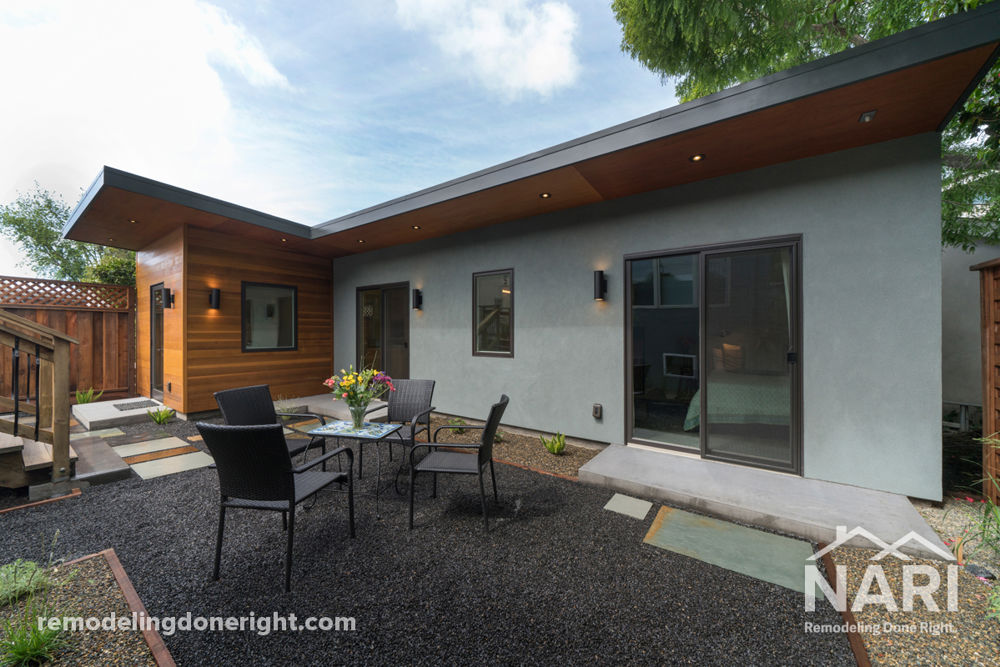 Our client's backyard was dominated by an old garage and garden shed. Renovating the entire structure into an accessory dwelling unit (ADU) allowed her to downsize in her retirement and rent out the main home. A primary challenge was designing workable living spaces within the shape of the existing structure. By taking advantage of the existing building's location close to the rear and side property lines, we could maximize the backyard space with a 439-square-foot one-bedroom ADU. On paper, 439 square-feet sounds small, but when stretched out with the kitchen separating the private bedroom from the living room, the building feels far more spacious. The client was thrilled with the results.