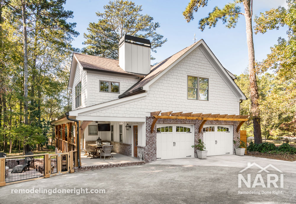 Feel right at home in Roswell's largest carriage house, which was custom built to fit the mother's taste. With all the exterior features of a high-end home, including gas lanterns, a mix of board-and-batten and shake style siding, larger cedar timber accents, and a covered patio to die for, you would never imagine this is secondary to the main house. Creamy whites, warm woods, and classic brick work tie together to create an elegant exterior. In the interior, this carriage house includes a bourbon room, dog shower, one-and-a-half baths, a full kitchen, living room, bedroom, and an office.