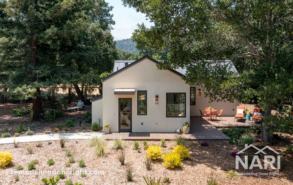 The main goal was to create a cottage that offers complete privacy from the main house while simultaneously catering to the needs of two seniors, enabling them to maintain their independence for as long as possible. The result is a beautiful ADU where the age-in-place features are seen as beautiful design and an L-shaped cottage that blends well with the surroundings. It has lots of windows and a wrap-around deck with French doors in every room to maximize the indoor/outdoor connection. Skylights bring in the natural light.
