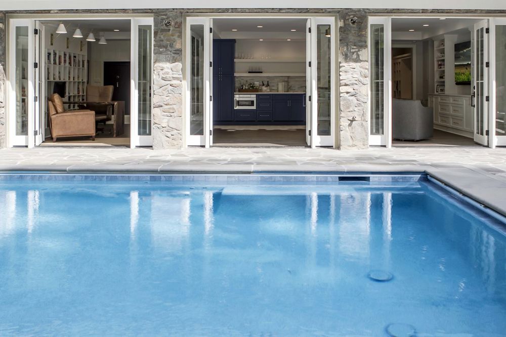 A 3-car garage was redefined into a pool house and executive office space to enhance the client's lifestyle within their primary home. The pool house combines convenience and luxury, featuring an executive office, kitchen, living space for a game table and TV viewing, a bathroom with changing and storage areas. Designed for seamless transitions between working, swimming, lounging, and entertaining, the space stays organized and clutter-free. Blending natural and modern materials, the structure includes original stone accents, weather-resistant wood and tile finishes, and glass doors. This space offers the perfect balance of work, relaxation, and entertainment.