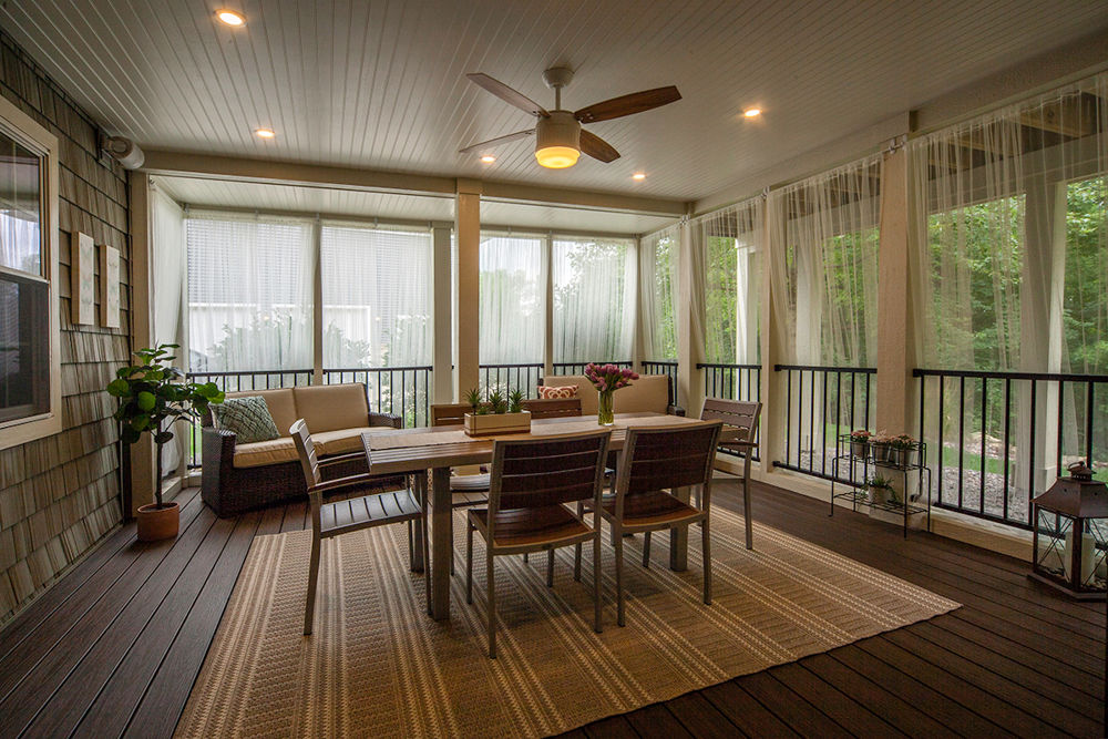 After attempting to use different patio furniture and Christmas lights in this plain covered patio, it was clear that the space was not practical or inviting. This exterior was upgraded with integration in mind. Materials and colors of the existing exterior were repeated in the patio. The new decking matches the deck above. The beadboard ceiling was painted to match the exterior trim, making the patio feel like an exterior room while simultaneously concealing the gutter system. The once underutilized space now is a highlight of the home. The clients now enjoy hosting family gatherings or just curling up with a good book on summer evenings.