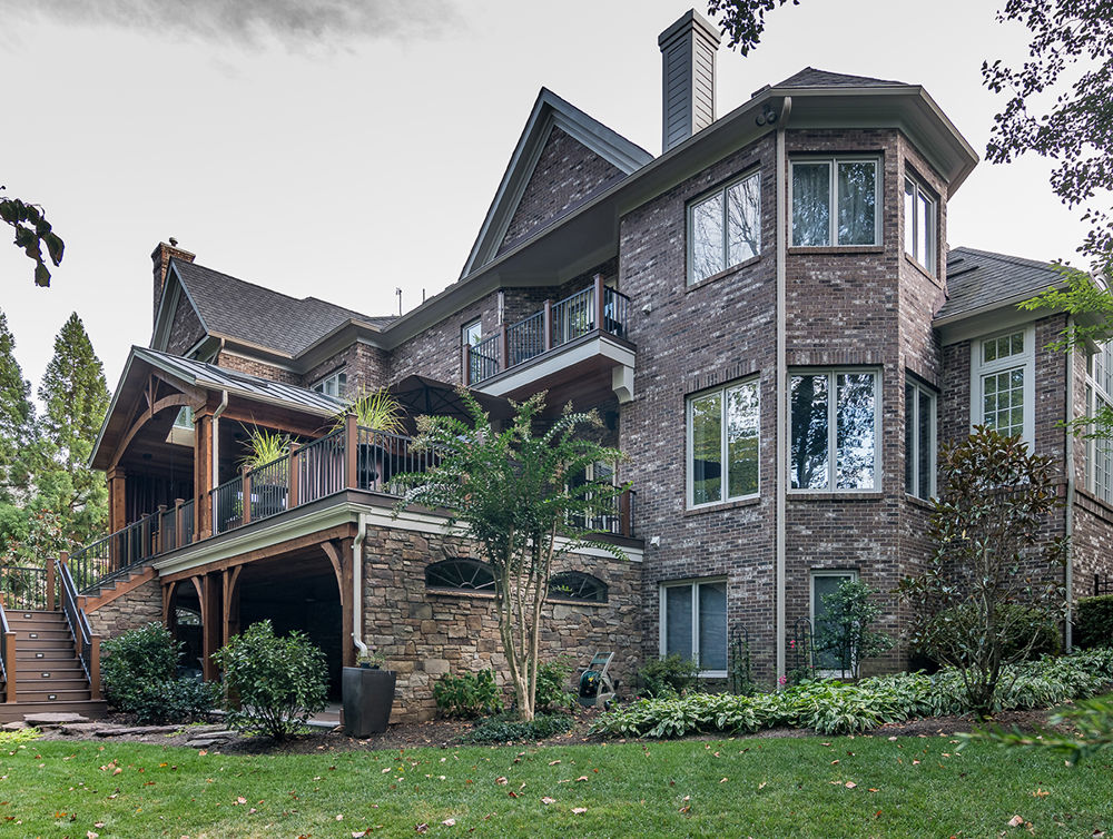 These clients entertain a lot and often host their three children's sports teams parties. They wanted an outdoor space that could accommodate large informal parties, under covered spaces, on two levels of their home, more storage and privacy-all with an Aspen Ski Lodge feel. The upper level has seating areas and dining for six, with an outdoor TV, grill and custom swinging bed under the covered space. The covered patio has privacy walls with arched transoms, and hidden storage under the new stairs. Tongue-and-groove Cedar boards below the rafters and a stone façade helped create the Aspen Ski Lodge feel the clients desired.