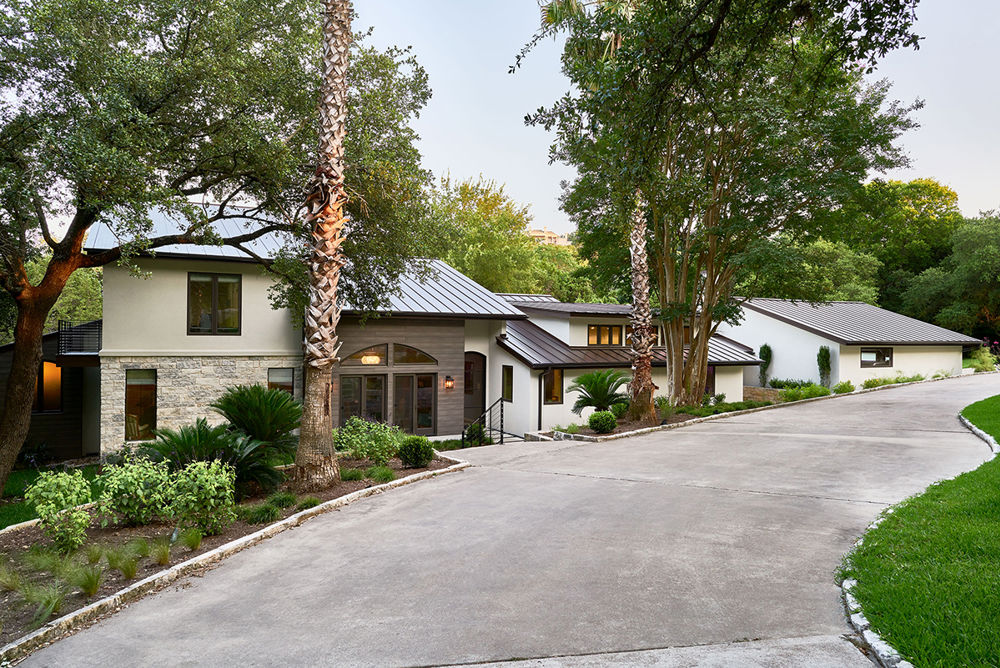 This project came about because the homeowners did not trust the exterior's construction quality and they weren't happy with the style. Prior to the purchase, the residence had been flipped by someone looking to make a quick buck and corners were cut to achieve the greatest return on investment. They requested a well-built, low-maintenance exterior with a variety of cladding materials to lend some visual interest to a home that was very monochromatic. A new metal roof, wood-look composite planks on portions of the exterior, and exterior sconces that complement the cladding and chimney caps met their request.