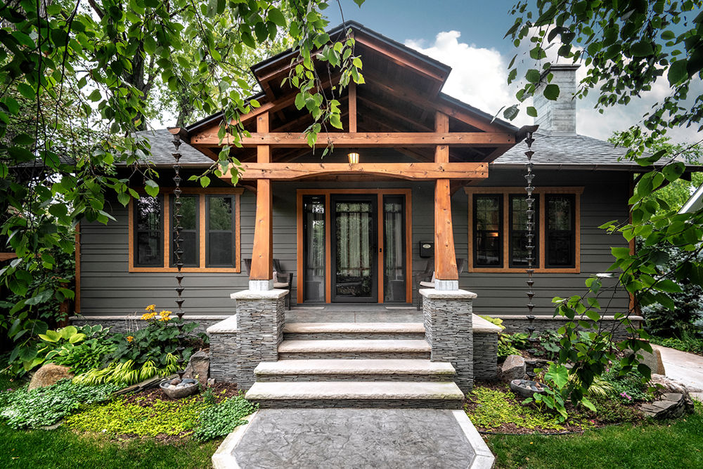The owners of this 1924 Minneapolis home wanted to transform it into a modern sanctuary, preserving the original Craftsman feel while updating it with stylistic elements inspired by their travels in Asia. Their new home exterior includes a timber-framed portico designed to look like a temple entrance; hand-cut and stacked slate stones set around the lower perimeter of the house; lap siding laid out in a unique organic pattern; trim boards that echo the temple motif; and a copper-and-stone rain catchment system designed to look relaxing and beautiful.