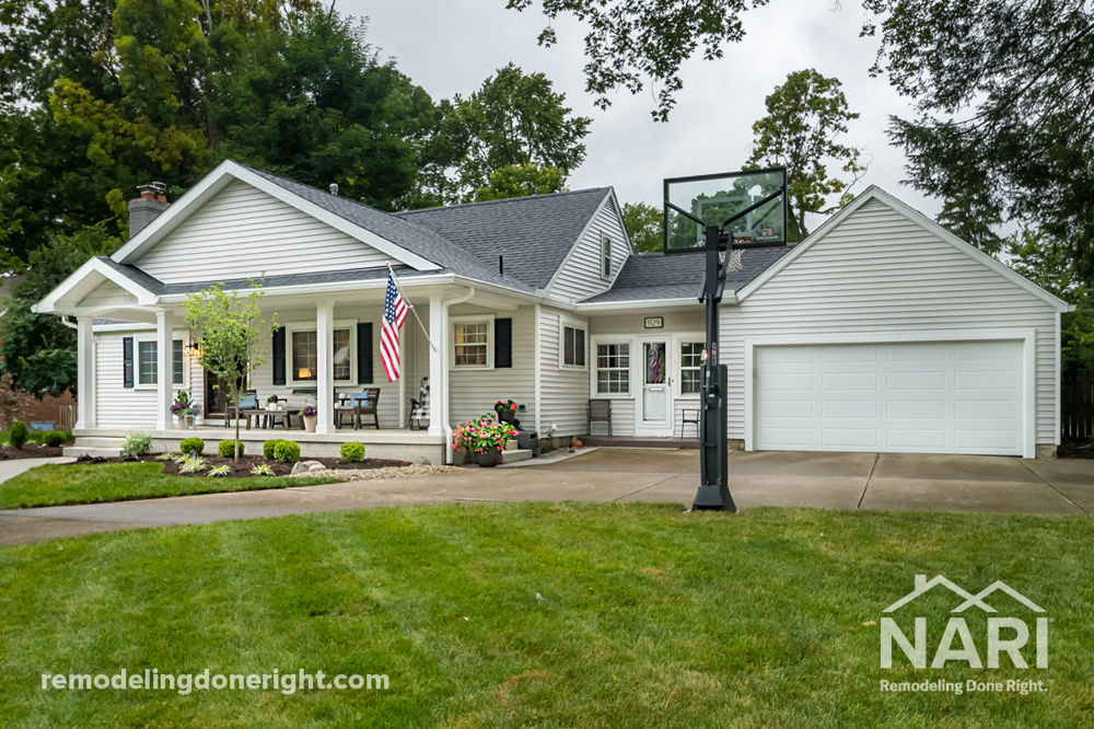 The owners wanted to remove the small existing portico and create a large front porch that extended across the face of their home. To achieve this, the existing portico, siding, shingles, gutters, facia, downspouts and shutters were removed. An 8-foot by 28-foot front porch with a gabled roof was built in its place. The existing roof above the breezeway was modified to accommodate the new porch roof. Fixing the significant water damage under the existing wood siding around the windows, garage door, and soffits was the greatest challenge. The home's exterior now features platinum gray colored vinyl siding, white trim and black shutters. The stately arched entry, metal columns and new front door complete the exterior's transformation.