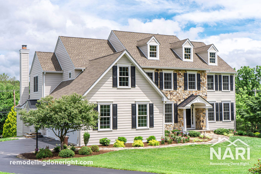 This project was a complete remodel of the exterior due to improper construction. The client wanted to repair and beautify his home's exterior so that it performs the way it was meant to. All moisture damaged sheathing, framing and insulation was repaired or replaced. The existing stucco was replaced with James Hardie siding and trim. The existing manufactured stone veneer was replaced with natural thin‐stone veneer. New windows include an upgraded window trim design. Even the existing garage jambs were swapped out with a custom trim package. The front entrance stoop and flagstone and the rear patio were removed and reinstalled with a waterproofing connection to the wall system.