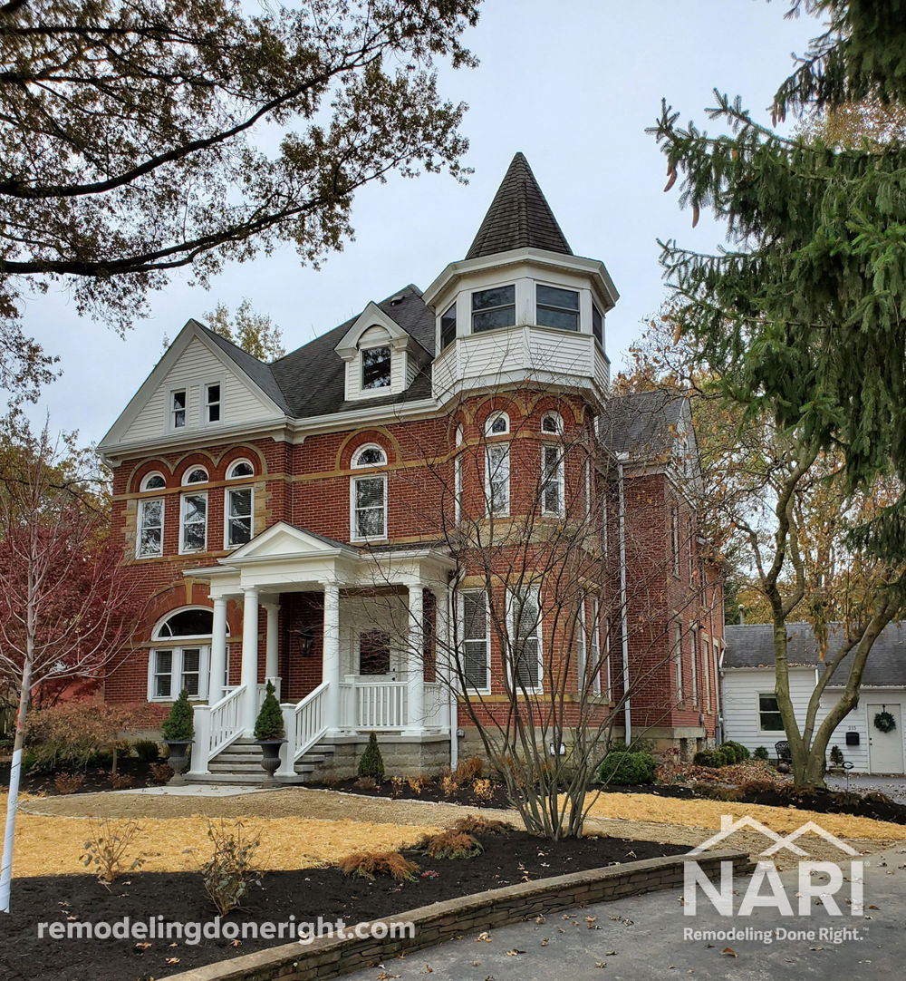 This brick Queen Anne home resembling a castle was the third home built on its street in historic Clintonville, Ohio. Before its first residents, this was once the Latin School, which was rented to the Clinton Township Board of Education. The clients desired a code compliant, stately front porch, deserving of this home. The new porch features historically appropriate trim, moldings and railings constructed from low-maintenance urethane foam; and columns made of round-tapered fiberglass. The period appropriate beadboard ceiling was painted blue and has recessed ceiling lighting. The new split-face block at the foundation complements the 137-year-old foundation, and includes a weatherproof outlet.