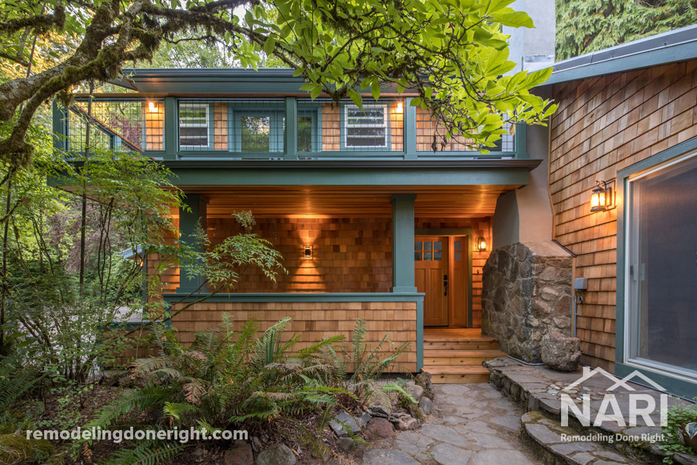This woodsy home nestled along the river was in serious need of some TLC. Years of owner-applied fixes and poor remodel jobs left the home's exterior in a rotted and dreary state. There were multiple types of siding, out-of-plumb walls, and clear distinctions between the original home and subsequent additions. The project repaired the extensive dry rot damage, increased functionality of outdoor spaces, and updated the home's exterior with an architectural design that reflects the home's natural surroundings.
