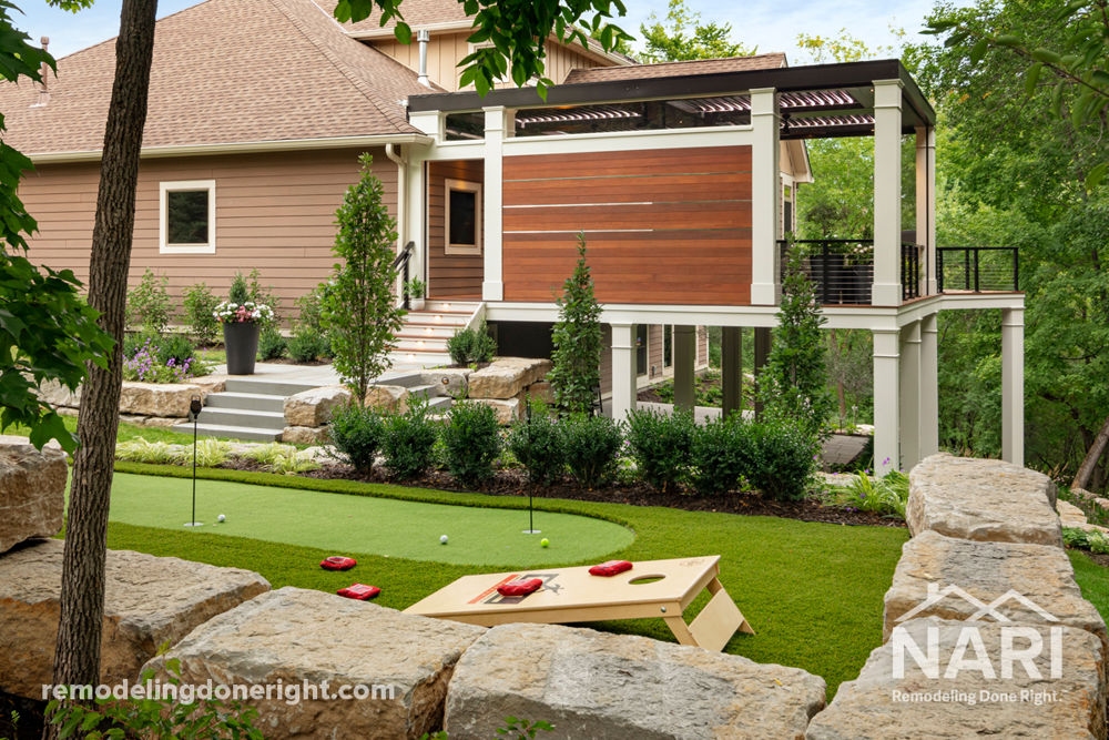 This home has a beautiful wood-panel pub that led to a deck barely big enough for a grill. The clients wanted to open the room to a much more substantial deck to accommodate larger gatherings and integrate the indoor and outdoor living spaces while preserving their privacy. The new wrap-around Ipe deck has a striking pergola fitted over half of it. Mechanical louvers, disappearing screens, efficient heaters and a privacy wall create a versatile environment that deflects rain, chilly weather, insects and prying eyes. It also affords direct access to the putting green and property grounds. Wide, bi-fold doors integrate the pub with the new outdoor space.