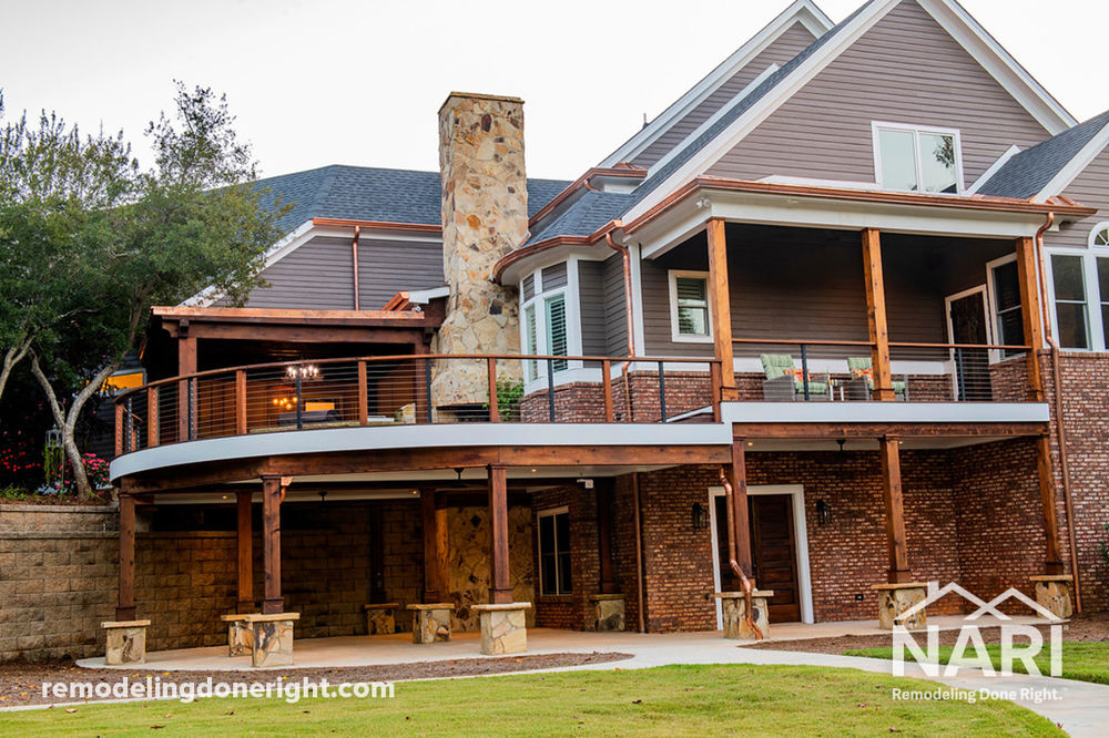 The clients wanted to add an outdoor feature that was unlike any other while pushing the boundaries of craftsmanship. A 34-foot masonry chimney was built as the focal point for main level entertaining and includes two fireboxes that serve both the existing patio and the deck. A new IPE radius deck with steel cabling installed in the handrail wraps around the house from the existing patio to the master bedroom, offering clear views of the property and pond. A concrete slab was poured below the deck, providing additional entertaining space underneath.