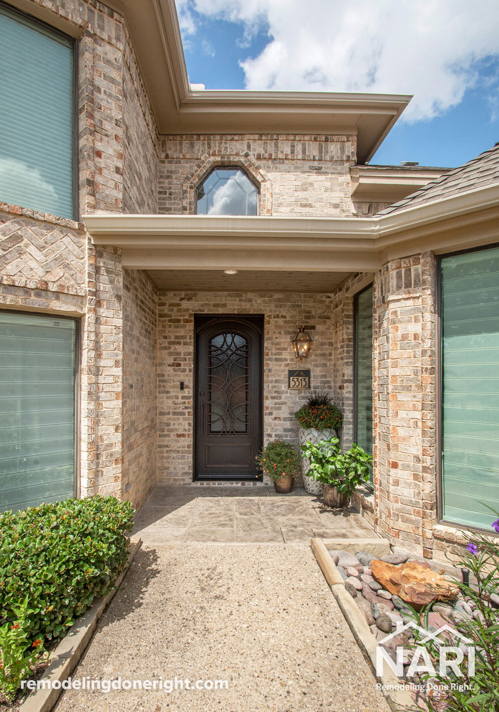 The clients wanted an outdoor covering of some sort over their entry. Their front door was completely exposed, and the elements were taking a toll on the unprotected door. They also felt that their entry was uninviting to guests and often meant coming home to wet packages. The new entry features a tongue-and-groove ceiling stained in slate grey, and a concrete entry pad with custom stamping and stain that was blended on site. A new 18-inch electric copper lantern was placed adjacent to the custom-designed hand-forged wrought iron door. The result provided some much needed curb appeal.