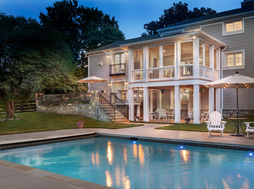 Every time the homeowners looked out their French doors to nowhere, they wondered if the doors were supposed to lead to a deck or something. But a previous renovation had fizzled before that issue was fixed. The owners realized they didn't need another deck; they wanted a porch that overlooks their swimming pool patio below and the fields and woods beyond. Those once idle French doors now lead to a spectacularly simple, restful and beautiful space. The stairway down from the porch is finished with wrought iron railings, which were continued around the perimeter of the raised patio and on the Juliet balcony above.