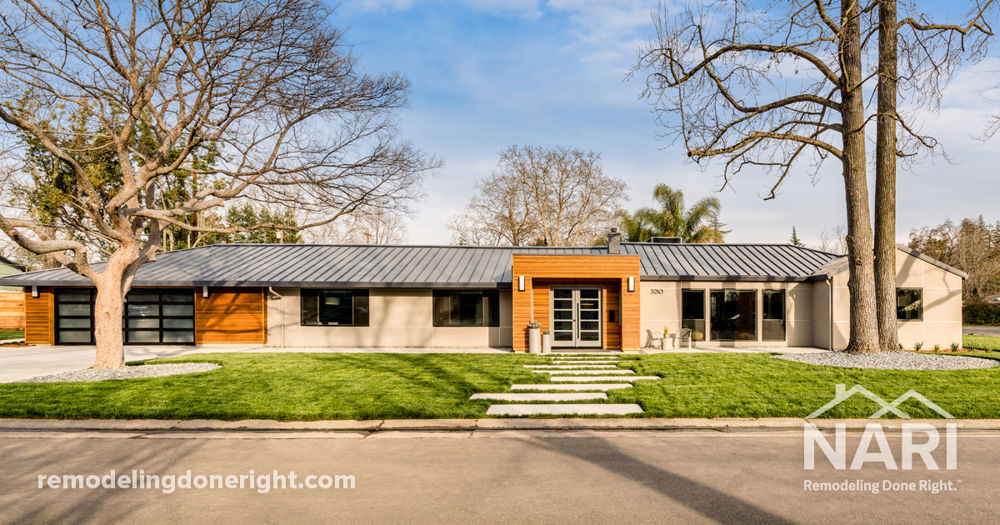 This client hoped to transform her 1940s home with a stunning, modern facade. Unfortunately, the house suffered from poorly executed previous remodels, including an unpermitted addition enclosing a carport and a subsequent garage conversion and new garage. These wood-framed additions were not in plane with or properly connected to the original concrete block made structure. The roof framing was over-spanned and failing vinyl siding and soffits were hiding more below-code and dangerous conditions. New windows and doors, new stucco and wood siding, and a relocated entry were capped with a standing seam metal roof to bring some much-needed sparkle to this uncut gem.