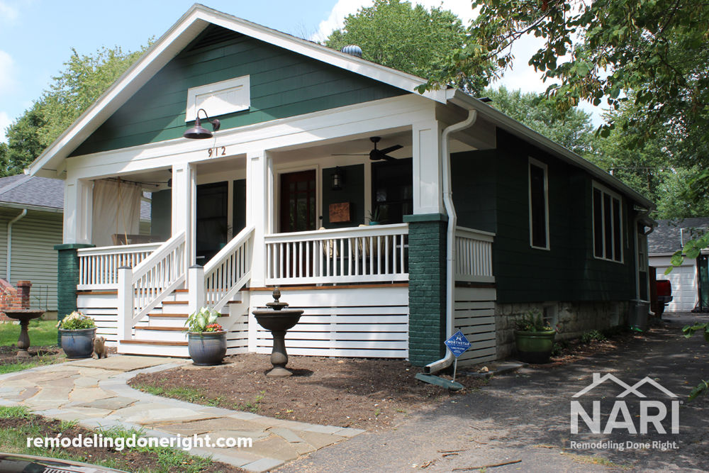 The Craftsman style exterior of this front porch was brought back to life while reinforcing structural elements -without compromising design. Removing the dark, dated and closed off screen porch helped create a welcoming entrance to the client's home. Uncovering completely rotted out deck framing and decking on day one allowed the clients to really customize their porch. Adding a rich deep green color to the body of the home offsets the cream white that highlights the trim detail, while integrating custom trim work with modern metal accents adds the perfect Craftsman style to the front porch.